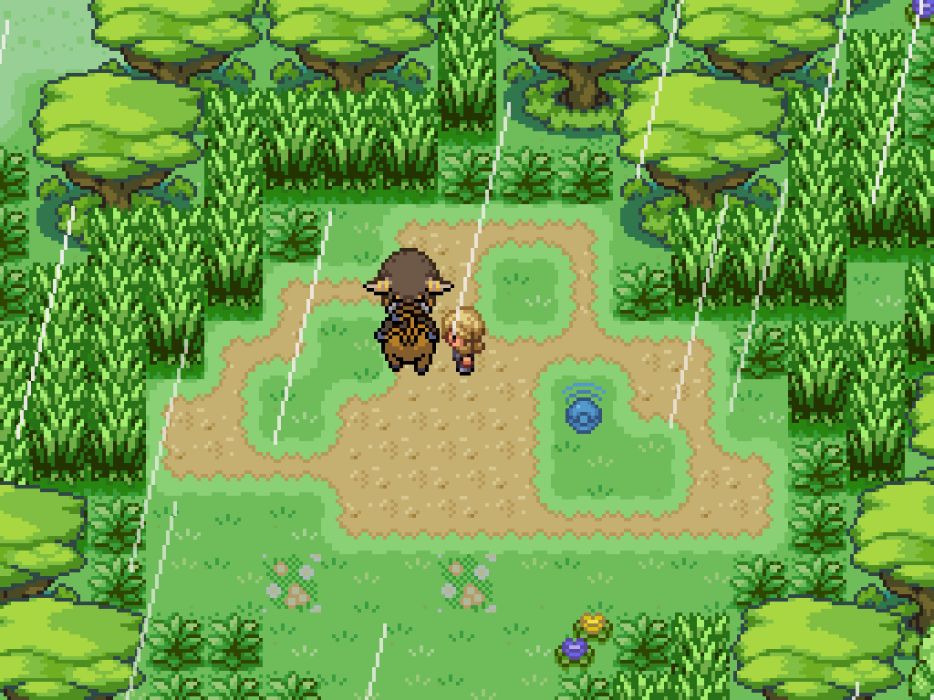 Finally, return to the third entrance whilst riding a Tauros; when you get to the area where the Tech Glasses were, continue going to the right instead and go through where you just destroyed the spiderweb and the log. Keep going until you reach a patch of tall grass; dismount the Tauros and you'll find the two Pokémon battling eachother. Kill the opposite to the one you want, and the other one will join you. You'll also find TM40 Aerial Ace here.